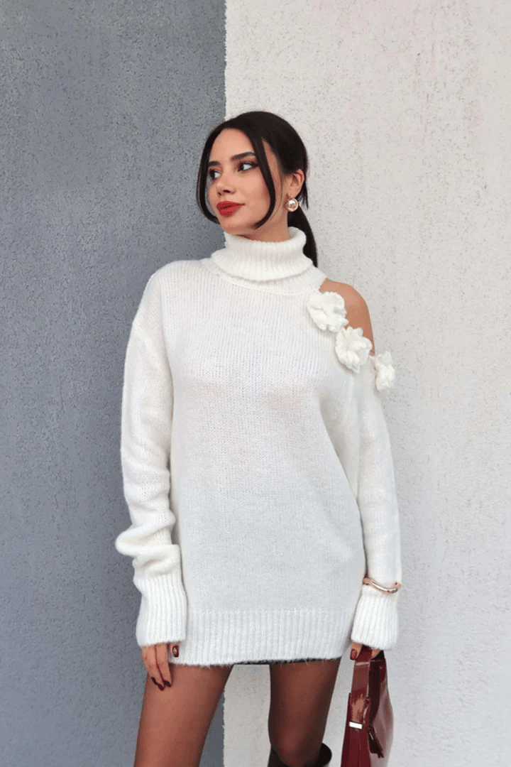 Wyjątkowy model łączący elegancję i oryginalność: ten golf z kwiatowym detalem na ramieniu to idealny wybór dla osób lubiących wyróżniać się stylem. Wykonany z miękkiej, ciepłej przędzy, idealnie sprawdzi się w chłodniejsze dni, nie rezygnując jednocześnie z kobiecego uroku.